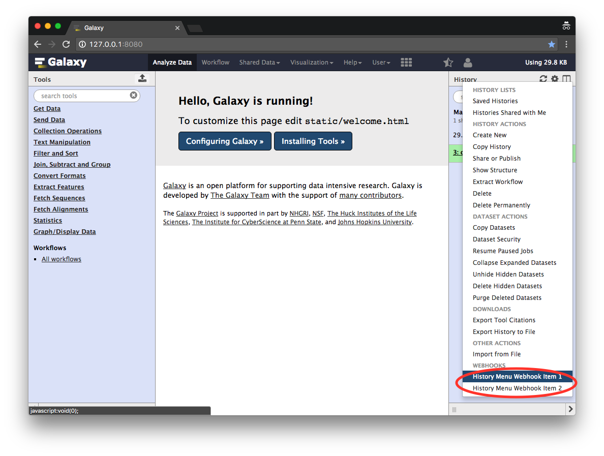 Galaxy webhooks provides a simple way of inserting icons, links, or other HTML elements into predefined locations. For this Galaxy provides some entry points which can be used to extend the client with content. This content can consists out of simple HTML, JS or dynamically generated content from a python function.